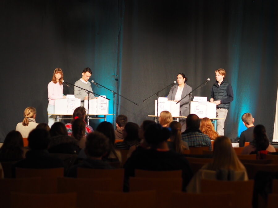 Tatkräftige Unterstützung bekam unser Debattierteam durch Janna (9b), Milla (9d), Leni (10a), Elisabeth (10c), Clara (10c), Anna T. (S1), Calista (S1), Oscar (S1), Jasper (S1), Johann (S1) und Lorenz (S1), die u.a. als Juror:innen und Zeitnehmer:innen im Einsatz waren. Herzlichen Dank dafür! Organisatorisch mitgetragen wurde der Wettbewerb außerdem vom MuG-Profil (S1) und dem CSS – auch dafür ein großes Dankeschön! Nicht zuletzt danken wir auch KitzCatering für die wunderbare Verköstigung.