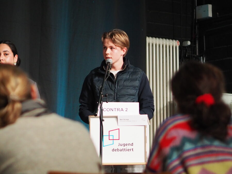 In der Oberstufe stritten Anna P. (S1), Liv (S1) und Ben (S1) zunächst über eine Kontaktgebühr für Arztbesuche sowie ein Verbot von „Kaufe jetzt, zahle später“-Bezahlmodellen, bevor es im Finale um die Frage ging, ob die Veröffentlichung von Wahlumfragen im Vorfeld von Wahlen verboten werden soll. Ben, der sich als einziger Corveyaner qualifiziert hatte, überzeugte die Jury in den vier entscheidenden Kategorien Sachkenntnis, Ausdrucksvermögen, Gesprächsfähigkeit und Überzeugungskraft und sicherte sich so den zweiten Platz – Herzlichen Glückwunsch! Damit zieht das Corvey erneut in den Landeswettbewerb im Hamburger Rathaus ein. Im Vorfeld erhält Ben die Möglichkeit an einem Rhetorik-Seminar teilnzunehmen, um seine Fähigkeiten noch weiter zu verbessern.