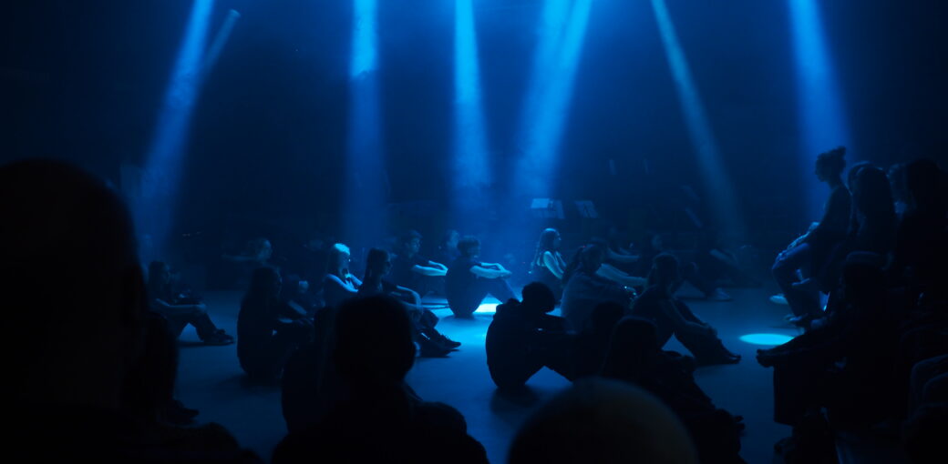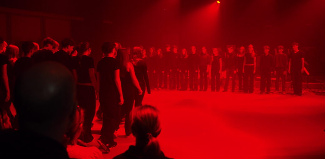 Die Veranstaltung begann mit einer musikunterlegten Lichtshow, zu der sich die über 40 Schüler*innen wie in Zeitlupe bewegten. Recht schnell bildeten sich aus dem Pulk zwei Lager heraus, deren Status nicht unterschiedlicher sein könnte. Während die einen Machtpositionen annahmen, fielen die anderen in der Rolle der Unterdrückten nach und nach zu Boden. Doch sie sollten nicht sprachlos bleiben. Nacheinander standen sie entschlossen wieder auf, um die Performance in einem gemeinsamen chorischen Part zum Höhepunkt zu führen. Den Blick geradeaus ins Publikum gerichtet zitierten sie den Holocaust-Überlebenden Rolf Abrahamsohn (1925-2021) in vielfältiger Weise, sodass sich der dabei entstandene Klangteppich bedrohlich über den Zuschauerraum legte.