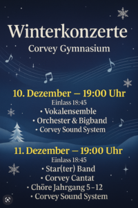 Am Donnerstag treten die Star(ter) band und die Chöre auf- darunter alle Chöre von Jahrgang 5-12 und unser Elternchor Corvey Cantat.